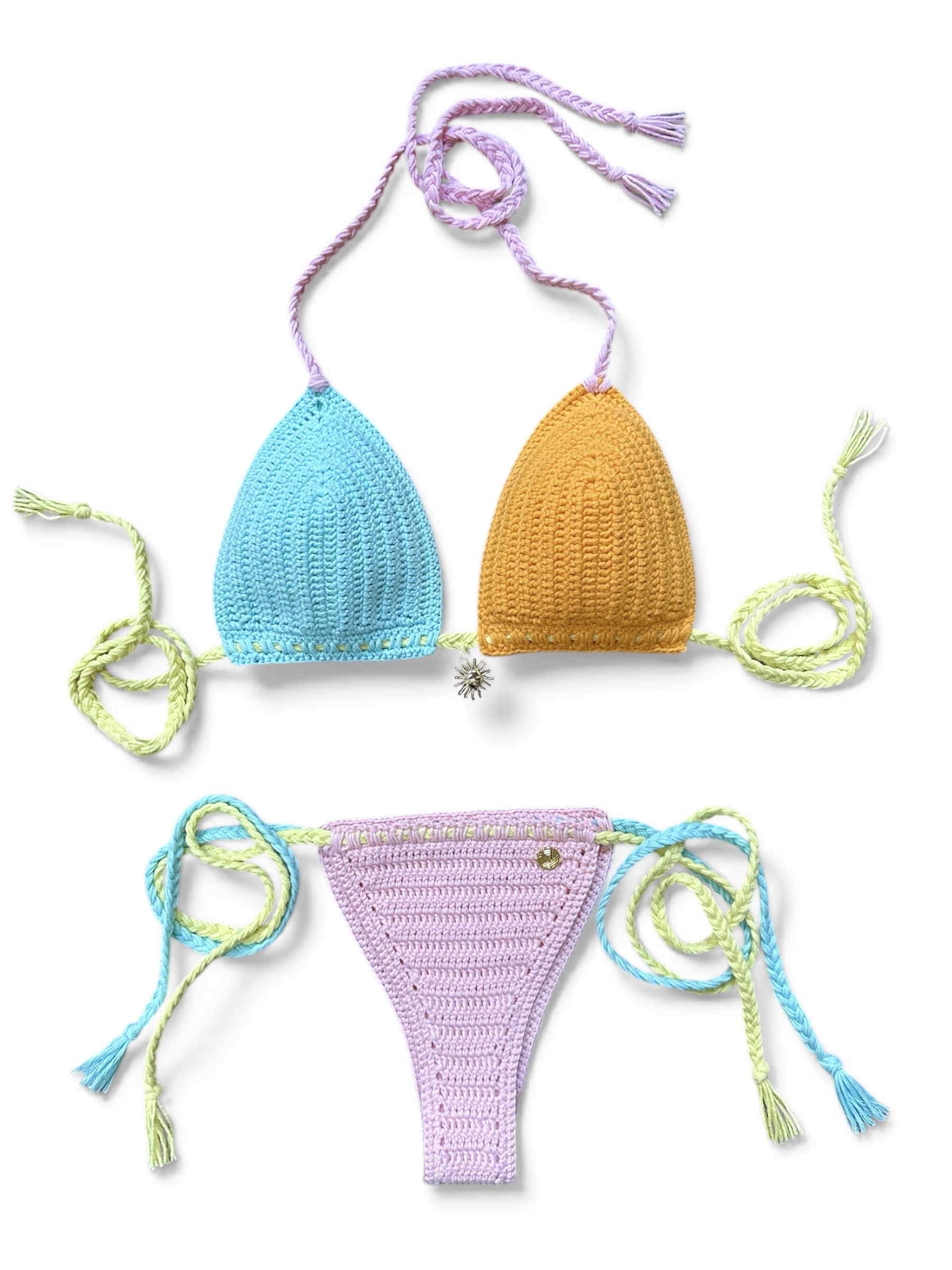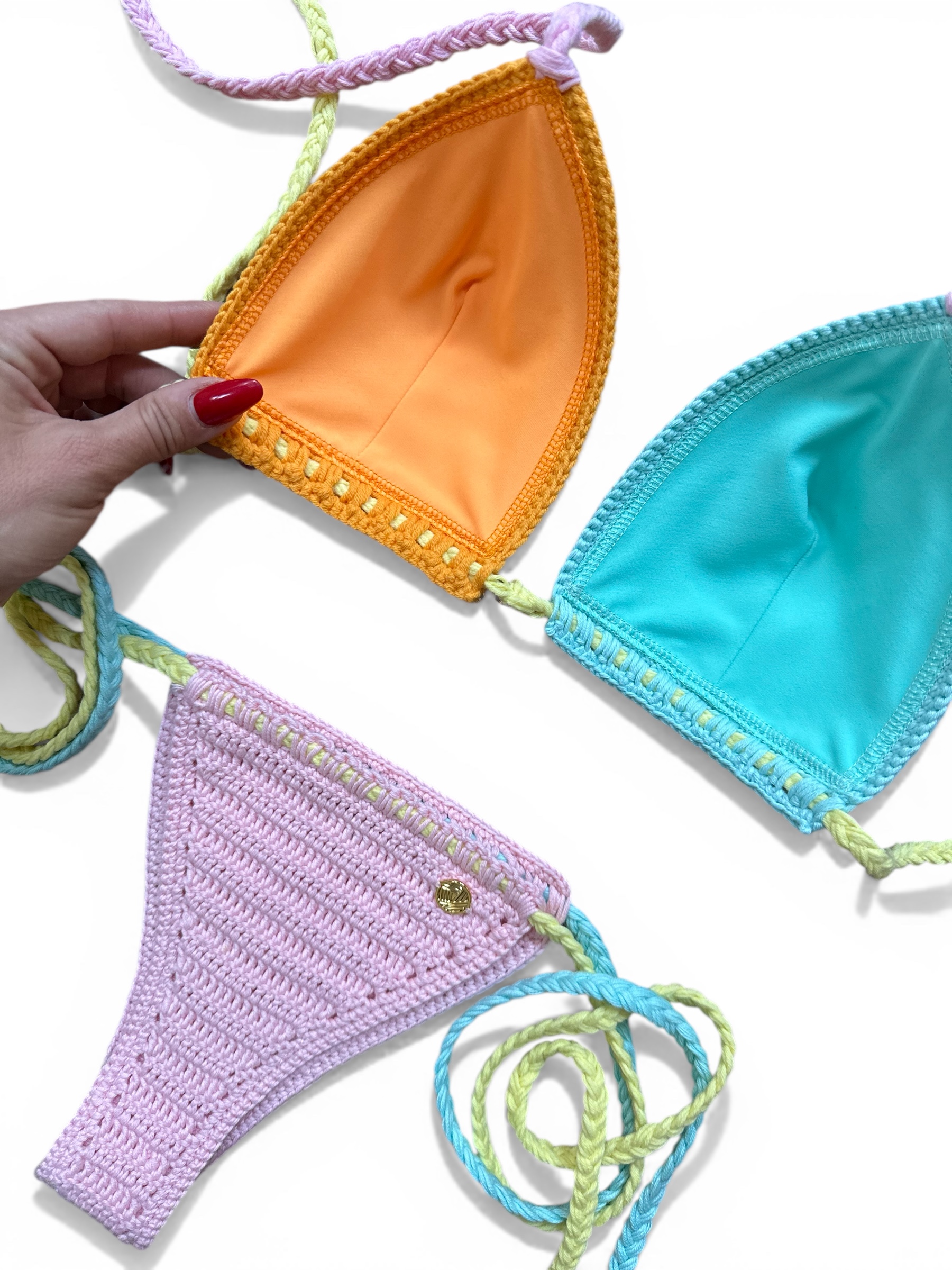 Ručne háčkované dvojdielne plavky v jemných pastelových farbách. Trojuholníkový vrch a nastaviteľné viazanie umožňujú prispôsobenie postave.